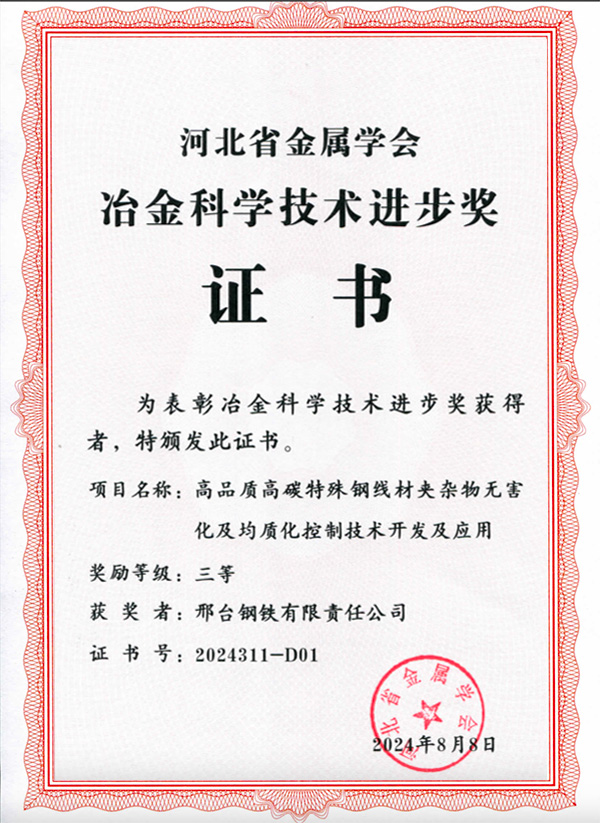 The project "Development and Application of Harmless and Homogeneous Inclusion Control Technology for High-Quality High-Carbon Special Steel Wire Rods" was awarded the Third Prize in the Hebei Metallurgical Science and Technology Progress Awards.