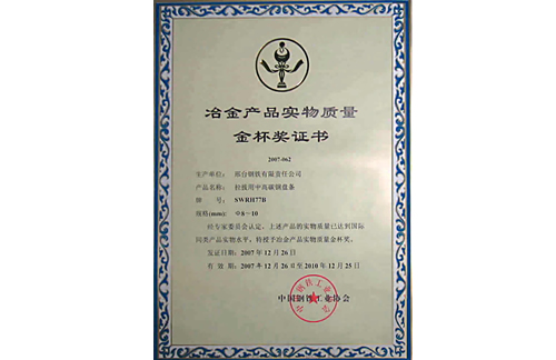 Xingtai Steel's wire, SWRH77B φ8-10mm,   was awarded the the Gold Cup Prize of Metallurgy products in 2007.