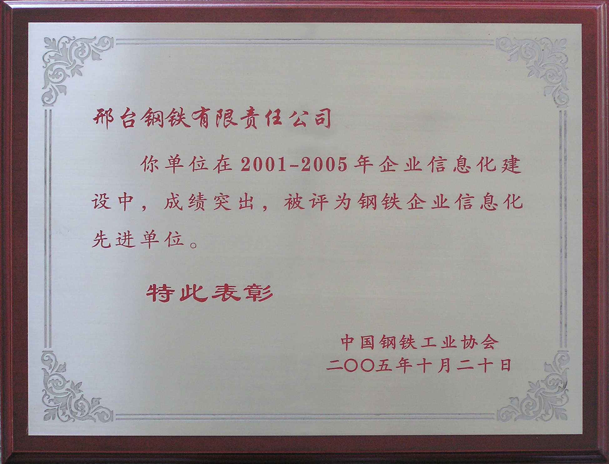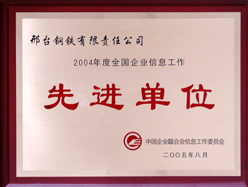 Xingtai Steel was awarded National Enterprise Information Work Advanced Unit of 2004.