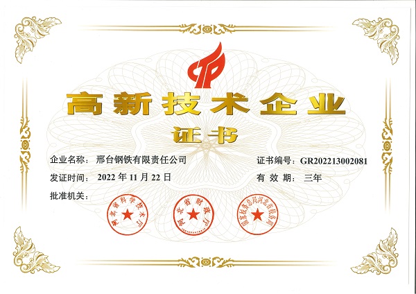 Xingtai Steel was named as "High-tech Enterprise" of Hebei Province. This is the four time after awarded in 2013.