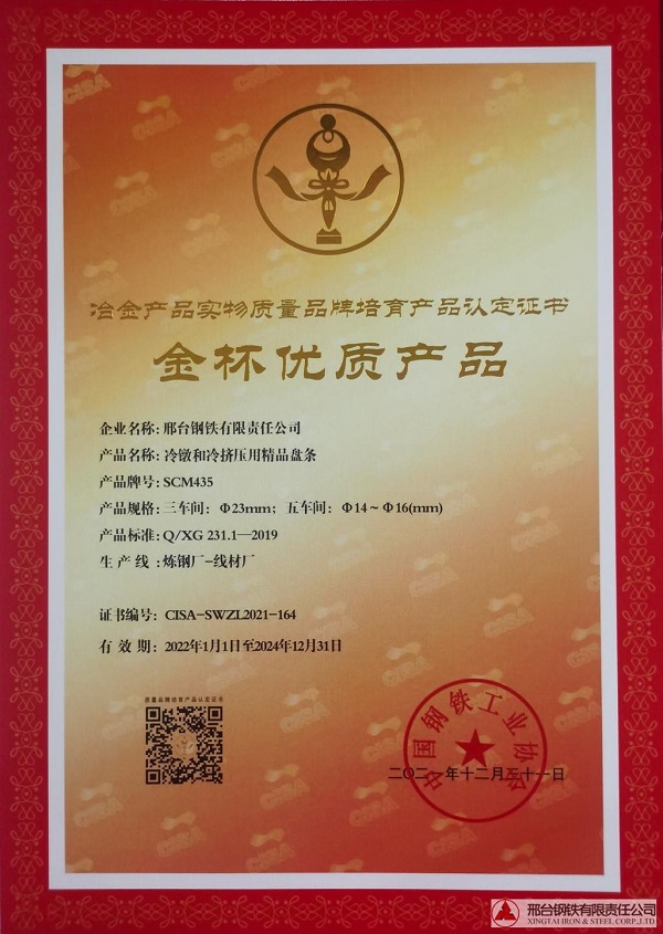 冷鐓和冷擠壓用精品盤條SCM435φ23mm;φ14-φ16mm規(guī)格獲冶金產品實物質量金杯優(yōu)質產品認定證書
