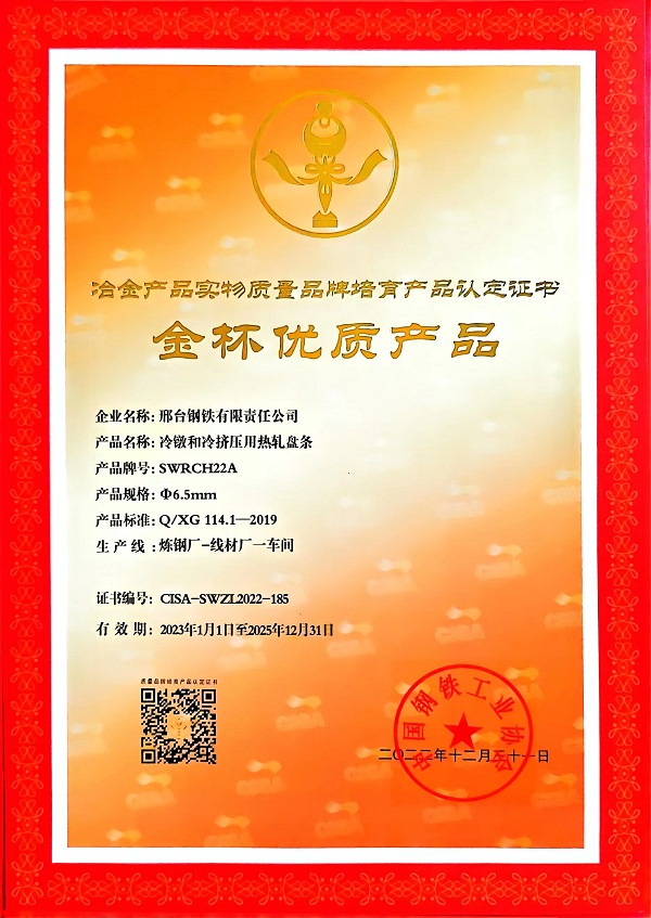 冷鐓和冷擠壓用熱軋盤條SWRCH22Aφ6.5mm規(guī)格獲冶金產品實物質量金杯優(yōu)質產品認定證書
