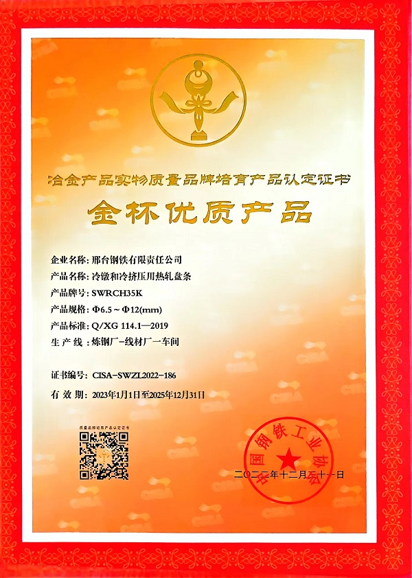 冷鐓和冷擠壓用熱軋盤條SWRCH35Kφ6.5-φ12mm規(guī)格獲冶金產品實物質量金杯優(yōu)質產品認定證書