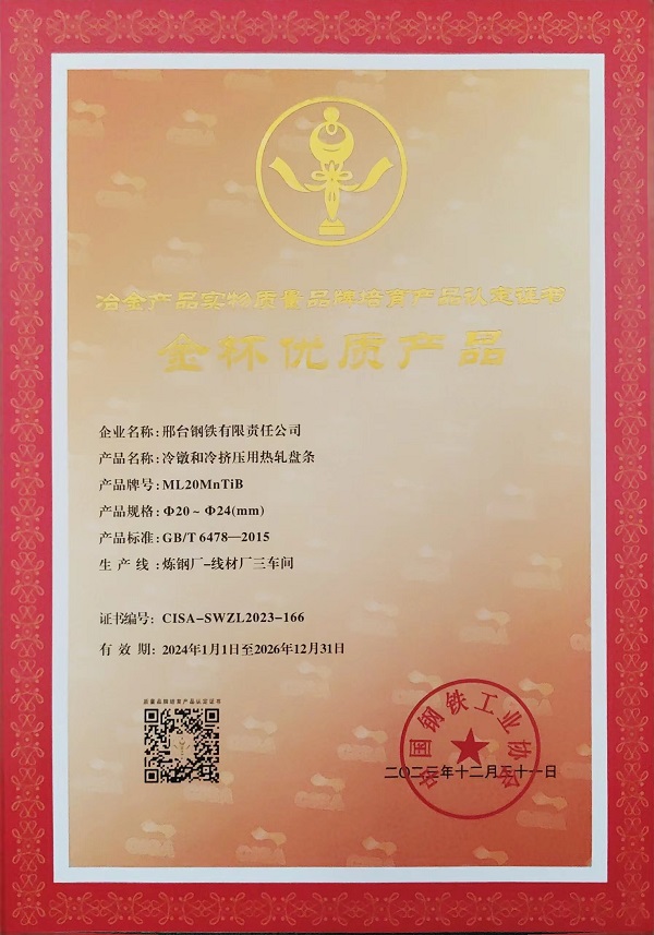 冷鐓和冷擠壓用熱軋盤條ML08Alφ20-φ28mm規(guī)格獲冶金產品實物質量金杯優(yōu)質產品認定證書