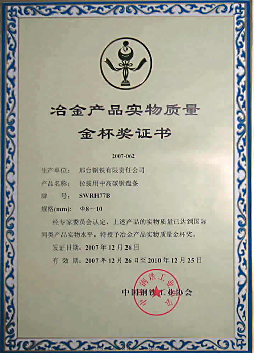 拉撥用中高碳鋼盤條SWRH77B獲冶金產(chǎn)品實(shí)物質(zhì)量金杯獎(jiǎng)