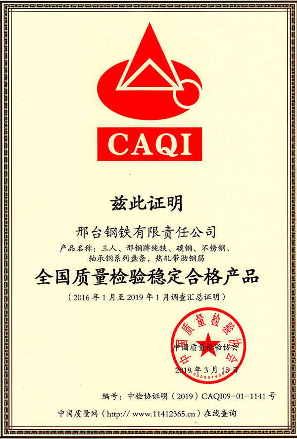 三人、邢鋼牌純鐵、碳鋼、不銹鋼、軸承鋼系列盤條,熱軋帶肋鋼筋產(chǎn)品,被評為全國質(zhì)量檢驗(yàn)穩(wěn)定合格產(chǎn)品。