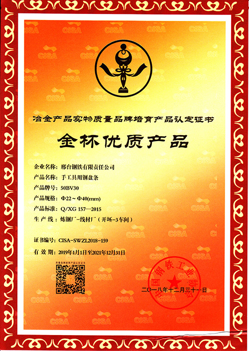 手工具用鋼盤條50BV30φ22-40mm規(guī)格,獲冶金產(chǎn)品實(shí)物質(zhì)量金杯優(yōu)質(zhì)產(chǎn)品認(rèn)定證書。