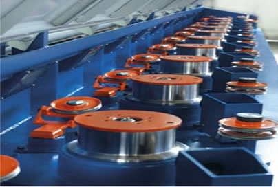 2、線材由放線機(jī)進(jìn)入拉絲機(jī)。經(jīng)過(guò)八次拉拔和八次卷筒冷卻,實(shí)現(xiàn)Φ4.9mm線材到Φ2.1mm線材的軋制。在最后一個(gè)卷筒后面,裝有一個(gè)舞臂單元,使拉絲機(jī)和收線機(jī)/收卷機(jī)保持同步。