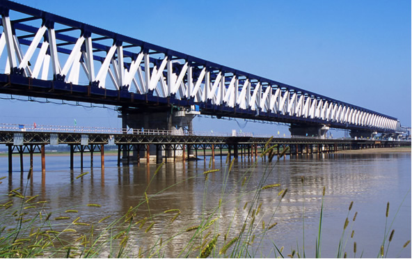 據(jù)中鐵大橋局介紹,鄭州黃河公鐵兩用橋具有四大特點:一是規(guī)模宏大,大橋公鐵合建長度達(dá)到九千一百七十七米,是迄今為止世界上最長的公鐵合建橋梁;二是設(shè)計標(biāo)準(zhǔn)高,橋上火車時速達(dá)到三百五十公里,創(chuàng)下世界特大型橋梁通行速度的新紀(jì)錄;三是結(jié)構(gòu)形式獨特,鋼梁采用了三主桁倒梯形結(jié)構(gòu),兩邊桁架是斜桁,此結(jié)構(gòu)在世界橋梁建設(shè)中系最先采用;四是施工方法新穎,該橋運用了“多點同步頂推”技術(shù),不僅在頂推最大跨度、總長度和總重量方面均創(chuàng)“世界之最”,而且減少了對河道的干擾和環(huán)境的破壞。