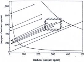 蒂森認為的RH脫碳前的最佳鋼水成分,如上圖中“方塊”區(qū)域所示, RH脫碳前鋼水成分范圍控制在方框內(nèi)時,鋼水脫碳處理后[C]、[O]均較低,將減少脫氧用鋁量,有利于提高鋼的純凈度。