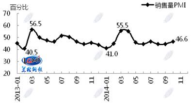 =鋼鐵市場活躍度略有好轉。10月銷售量指數(shù)為46.6%,較上月上升2.1個百分點(見圖3),表明10月份鋼貿(mào)企業(yè)銷售量增加,鋼鐵流通市場活躍度略有好轉。進入10月,隨著鋼鐵原料鐵礦石及鋼坯價格的先漲后跌,鋼材市場價格也呈現(xiàn)先漲后跌走勢,市場成交總體有所好轉。從區(qū)域看,六大區(qū)域銷售量指數(shù)除東北、西北地區(qū)有所下降外,其余地區(qū)均出現(xiàn)不同程度的回升。