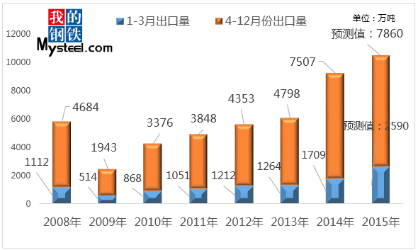圖表:2008-2015年國(guó)內(nèi)鋼材出口量情況及預(yù)測(cè)