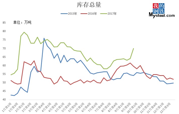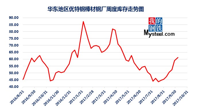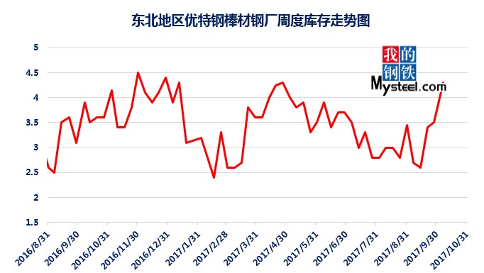 據(jù)mysteel統(tǒng)計的樣本優(yōu)特鋼廠庫存顯示,現(xiàn)全國優(yōu)特鋼廠棒材總庫存86.92萬噸,較國慶節(jié)前增加5.67萬噸,環(huán)比增加6.5%,較2016年國慶節(jié)后第一周庫存低0.31萬噸,較2016年均值高9.61萬噸,上漲12.43%。2017年內均值為84.43萬噸,當前庫存較均值增加2.49萬噸。樣本鋼廠總庫存連續(xù)7周上漲。