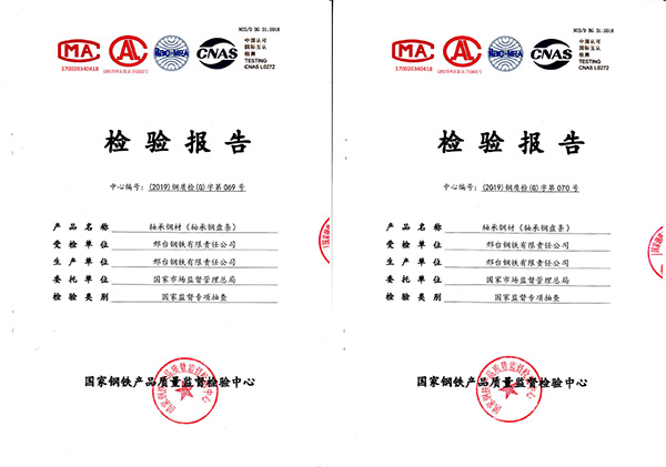 受國家市場監(jiān)督管理總局委托,2019年11月國家鋼鐵產(chǎn)品質(zhì)量監(jiān)督檢驗中心對邢鋼高碳鉻軸承鋼進行了監(jiān)督抽查,判定依據(jù)為《2019年軸承鋼材產(chǎn)品質(zhì)量國家監(jiān)督專項抽查方案》,現(xiàn)場抽取了2個批次盤條,近日公司收到檢測報告2個,結(jié)論為:所檢項目符合GB/T18254-2016《高碳鉻軸承鋼》標(biāo)準及抽樣方案,判定合格,報告中顯示,7大項29個項目結(jié)果全部高于該產(chǎn)品標(biāo)準,達到了高級優(yōu)質(zhì)鋼級別水平。