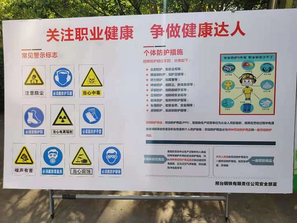 Each secondary unit and relevant office carried out in-depth self-assessment and strictly implement the responsibilities. In addition, Xingtai Steel also mobilized the workers to promote advocacy of building a healthy enterprise and encourage the whole staff to care, concern and support the creation of it. The creation activities of “healthy enterprise” will further strengthen corporate responsibility on health management, promote enterprises to improve the management system, stimulate enterprises to carry out health work, enhance workers’ awareness of occupational health self-management, laying the foundation for protecting and promoting the physical and mental health of occupational groups, improving health and labor productivity.