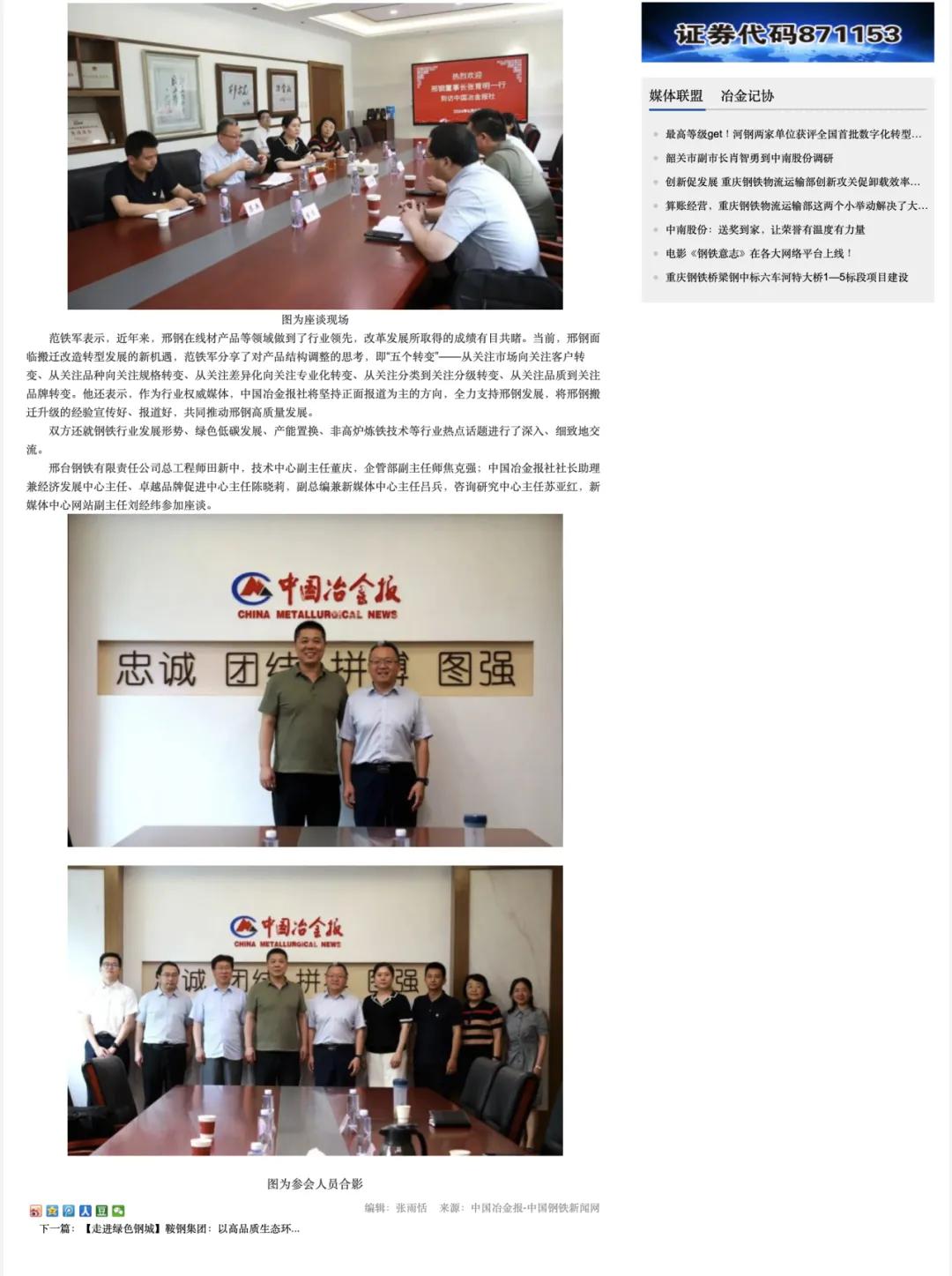 邢臺(tái)鋼鐵有限責(zé)任公司總工程師田新中,技術(shù)中心副主任董慶,企管部副主任師焦克強(qiáng);中國冶金報(bào)社社長助理兼經(jīng)濟(jì)發(fā)展中心主任、卓越品牌促進(jìn)中心主任陳曉莉,副總編兼新媒體中心主任呂兵,咨詢研究中心主任蘇亞紅,新媒體中心網(wǎng)站副主任劉經(jīng)緯參加座談。