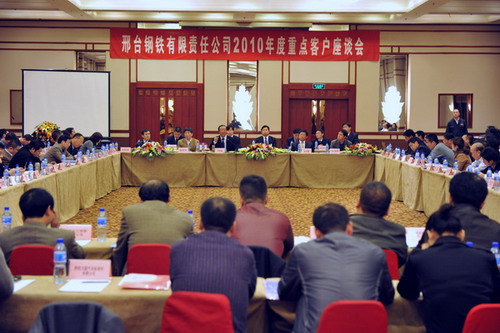 公司常務(wù)副總經(jīng)理張永藏向客戶代表詳細介紹了我公司今年1-10月份產(chǎn)品銷售情況、精品鋼生產(chǎn)情況、不銹鋼項目與產(chǎn)品、精品坯項目與產(chǎn)品、質(zhì)量反饋及2011年鋼鐵市場展望。張副總表示,在未來發(fā)展中,邢鋼將與廣大客戶精誠合作,充分發(fā)揮高端線材專業(yè)化生產(chǎn)的優(yōu)勢,進一步細分市場,以更好的服務(wù)、更精的產(chǎn)品滿足廣大客戶需求。